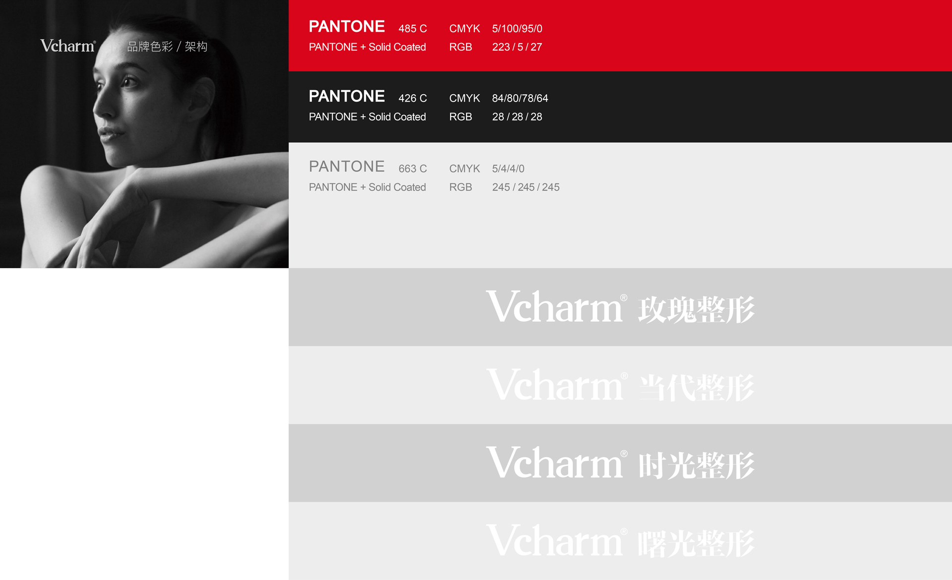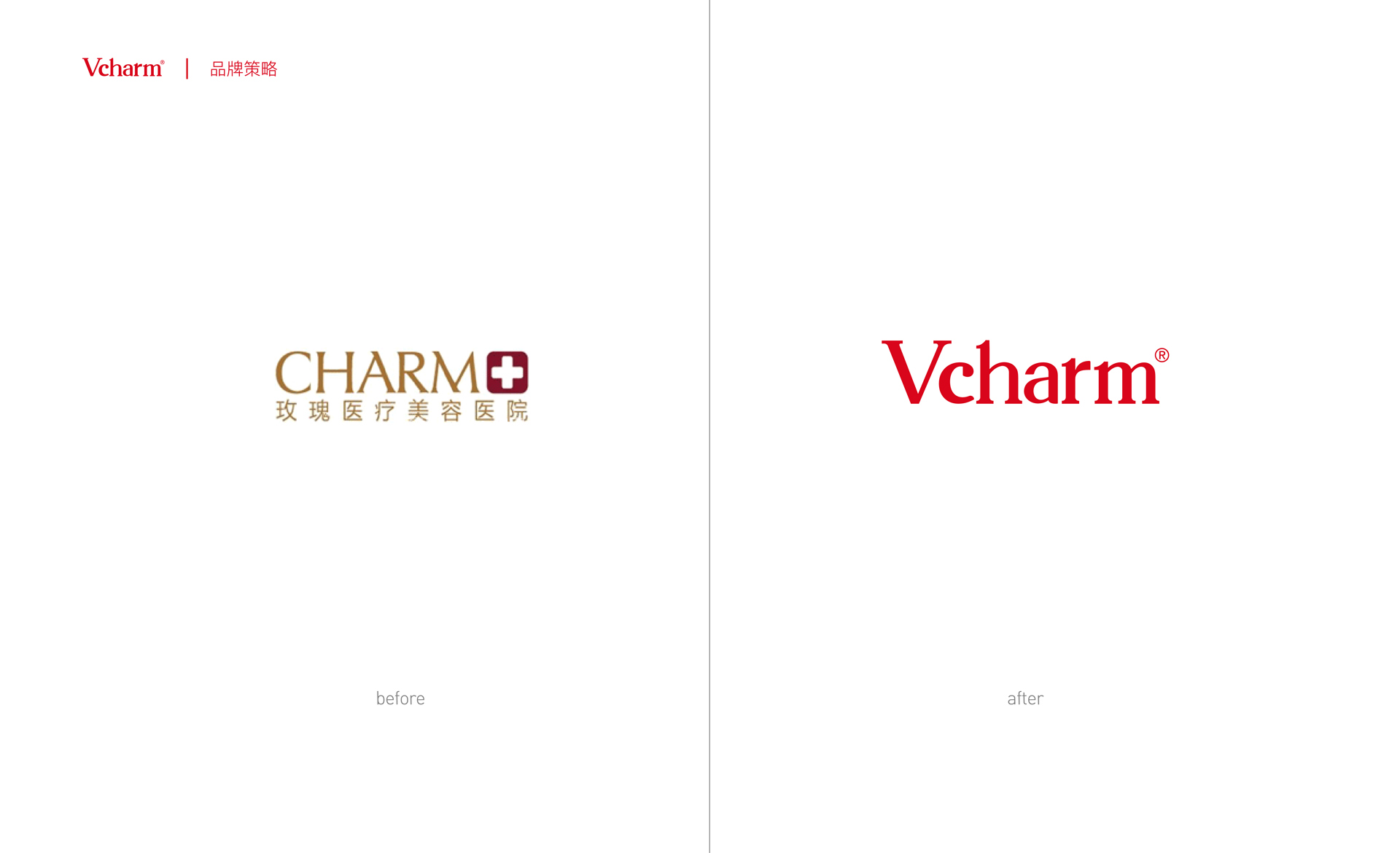 依據(jù)對美容整型產(chǎn)品行業(yè)的經(jīng)驗和分析,和與德為Vcharm品牌定制品牌專屬色:玫瑰紅,使得品牌在行業(yè)內(nèi)有一個很好的占位。其logo的設(shè)計典雅高貴,使品牌更加有包容性,為未來品牌整合做鋪墊。