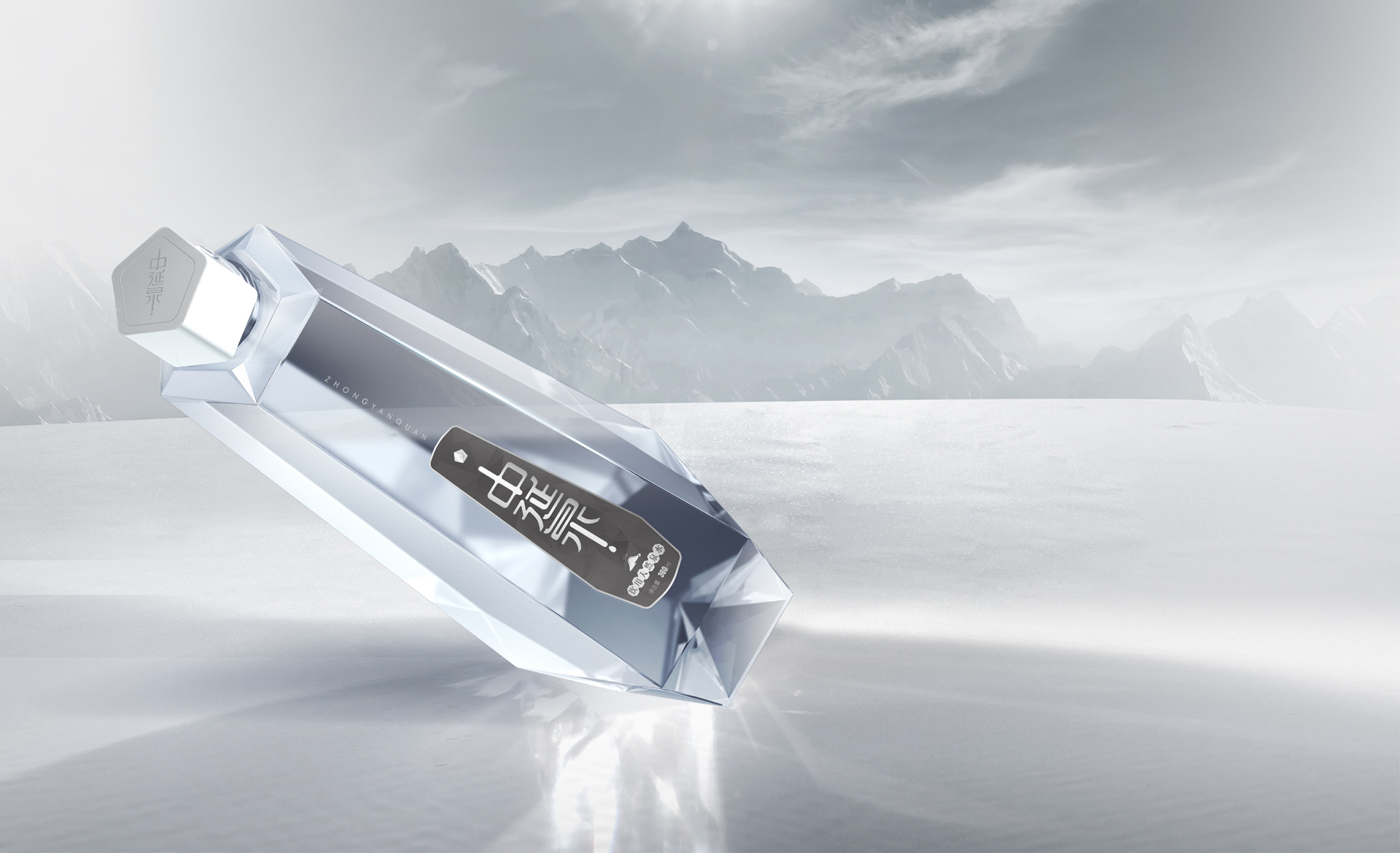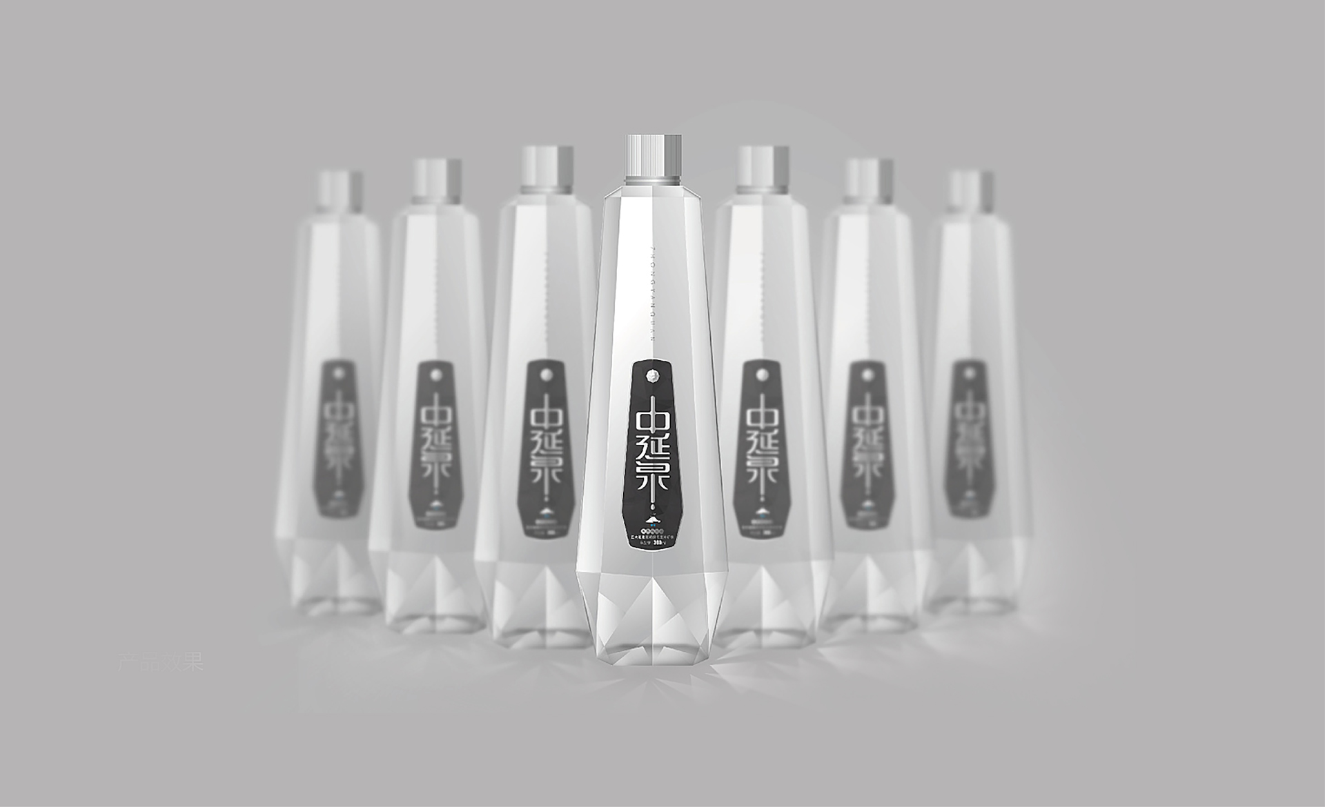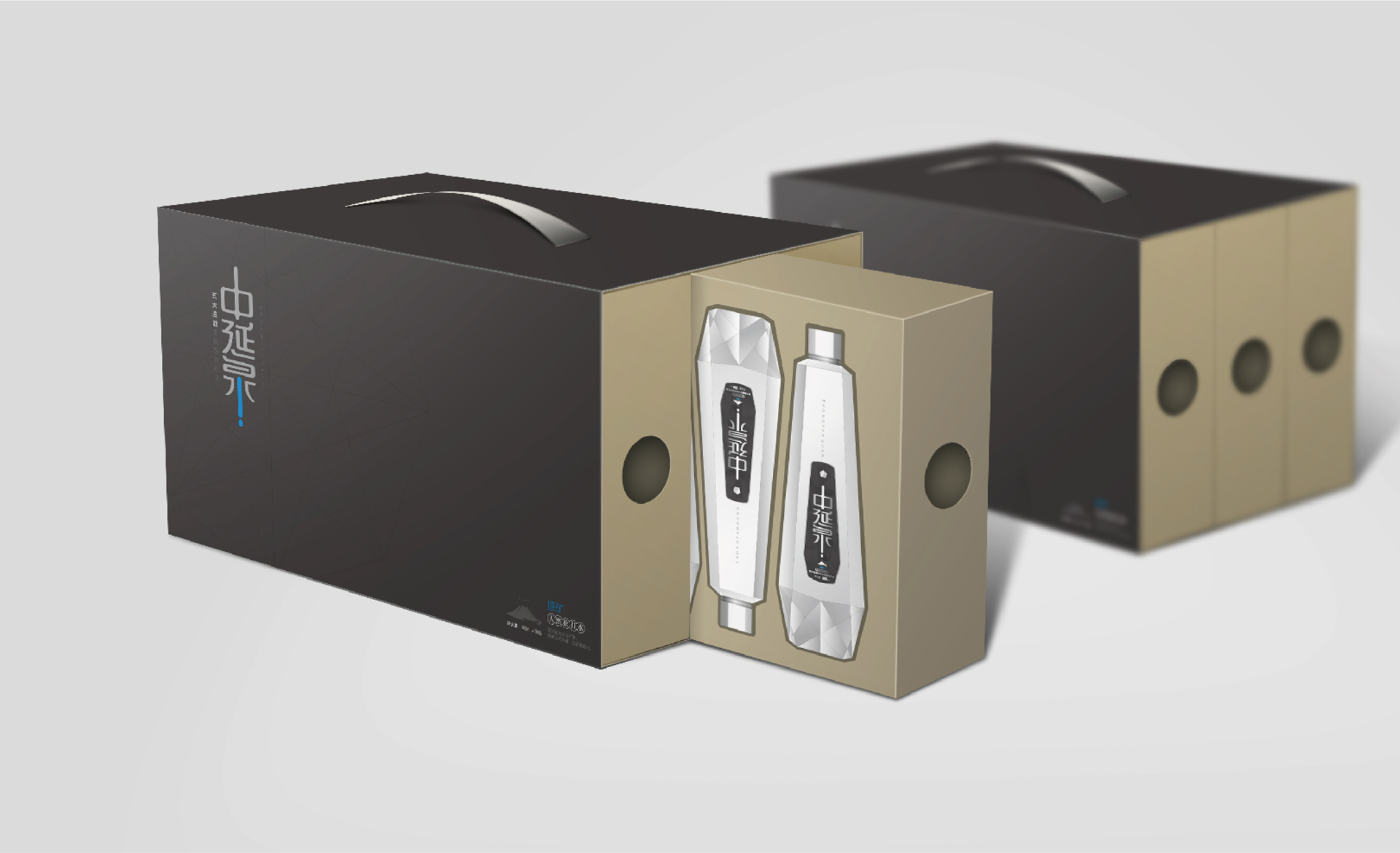 包裝設計概念采用了“鉆石”的外造型,是一個五邊形的異形包裝, 五邊形也喻意著五大連池。整體包裝呈現出一個結晶狀態的造型,也與五大連池的冰川水起到一個呼應作用。設計風格體現出很強的商務感,高級感,符合中延集團調性和品質感。