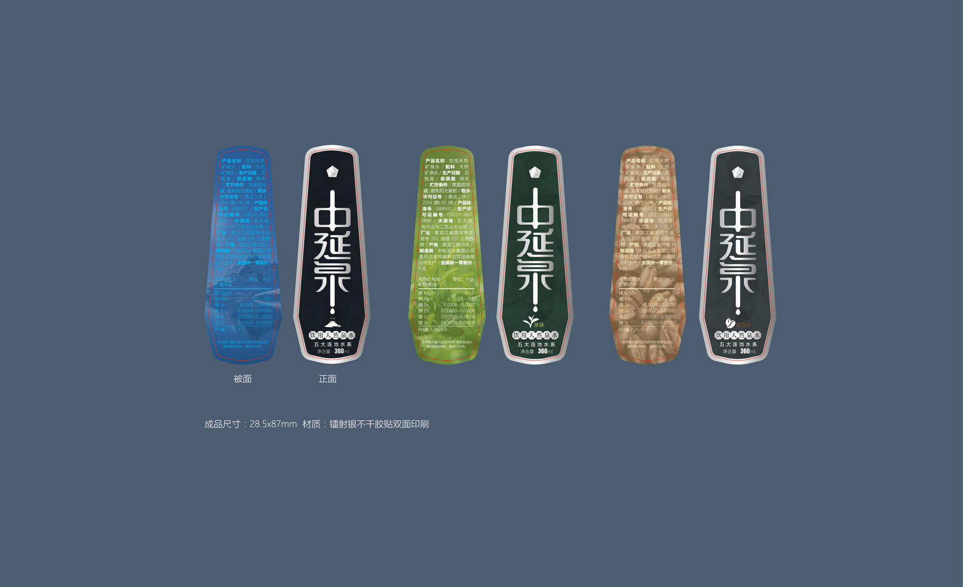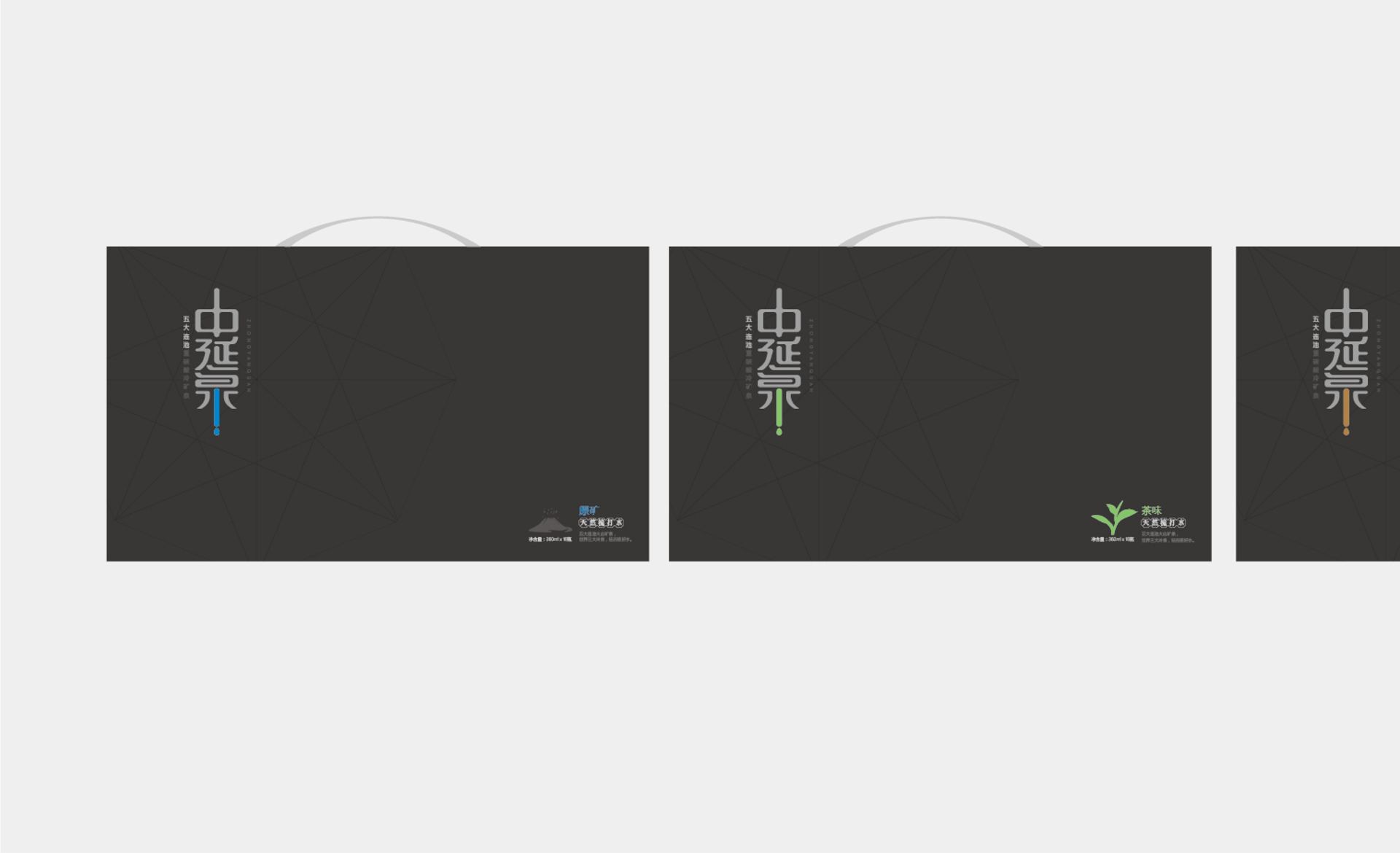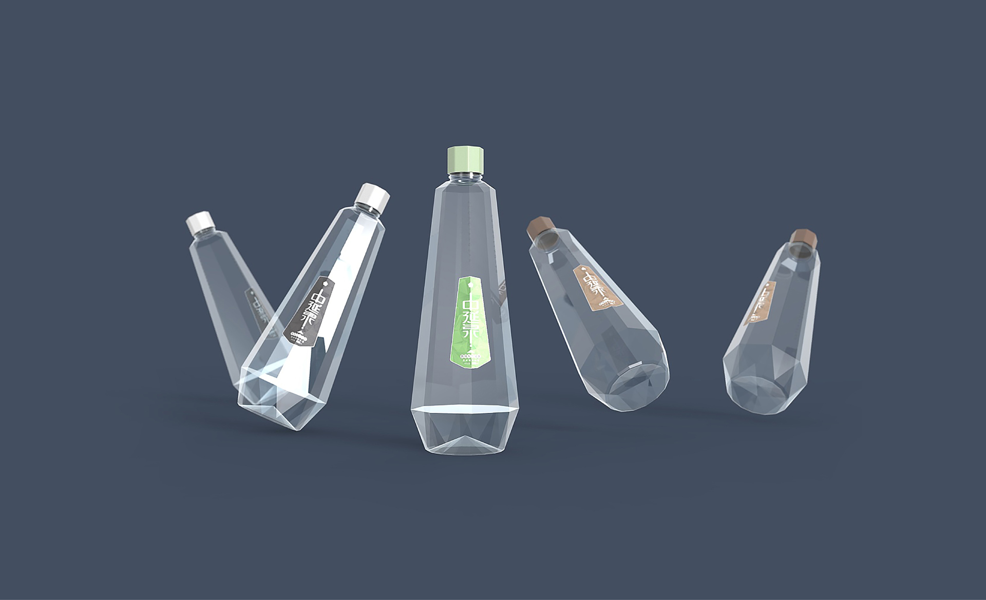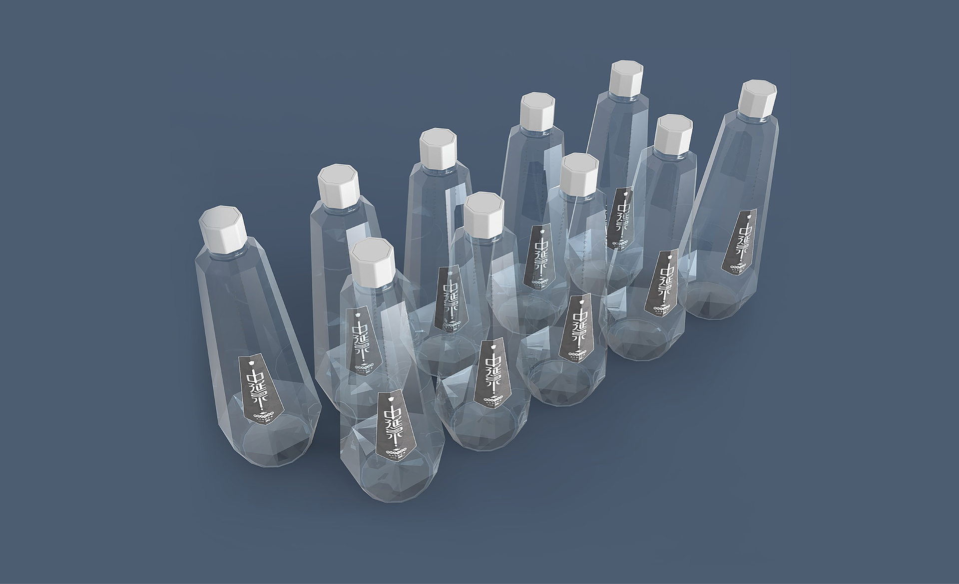 包裝設計概念采用了“鉆石”的外造型,是一個五邊形的異形包裝, 五邊形也喻意著五大連池。整體包裝呈現出一個結晶狀態的造型,也與五大連池的冰川水起到一個呼應作用。設計風格體現出很強的商務感,高級感,符合中延集團調性和品質感。