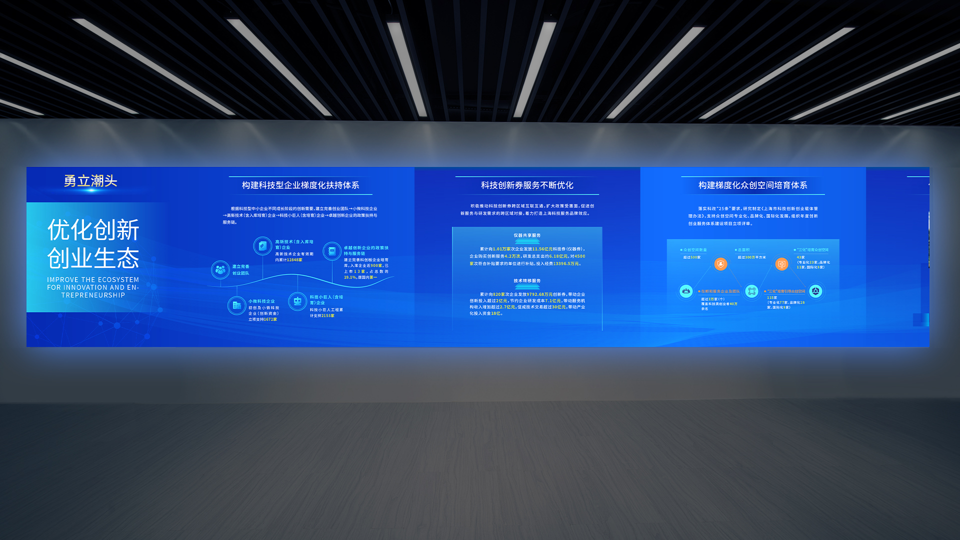 本次和與德為上海科創之窗展廳設計的風格現代、簡約,以創新和科技為主題,強調科技和人文的融合。展廳的整體空間采用白色為主色調,配合一些暖色調的燈光和配飾,營造出一個舒適、溫馨的氛圍。讓來訪者可以親身感受科技的魅力,增加參觀者的參與感和體驗感。此外,展廳內還設置了創新創業項目展示區、創新創業成果展示區等,展示了科創之窗所支持的創新創業項目和成果,讓來訪者了解到科技創新的最新成果和前沿技術。整個展廳的設計風格簡潔、明快、富有活力,很好地展現了上海科創之窗的創新、開放和活力的形象。