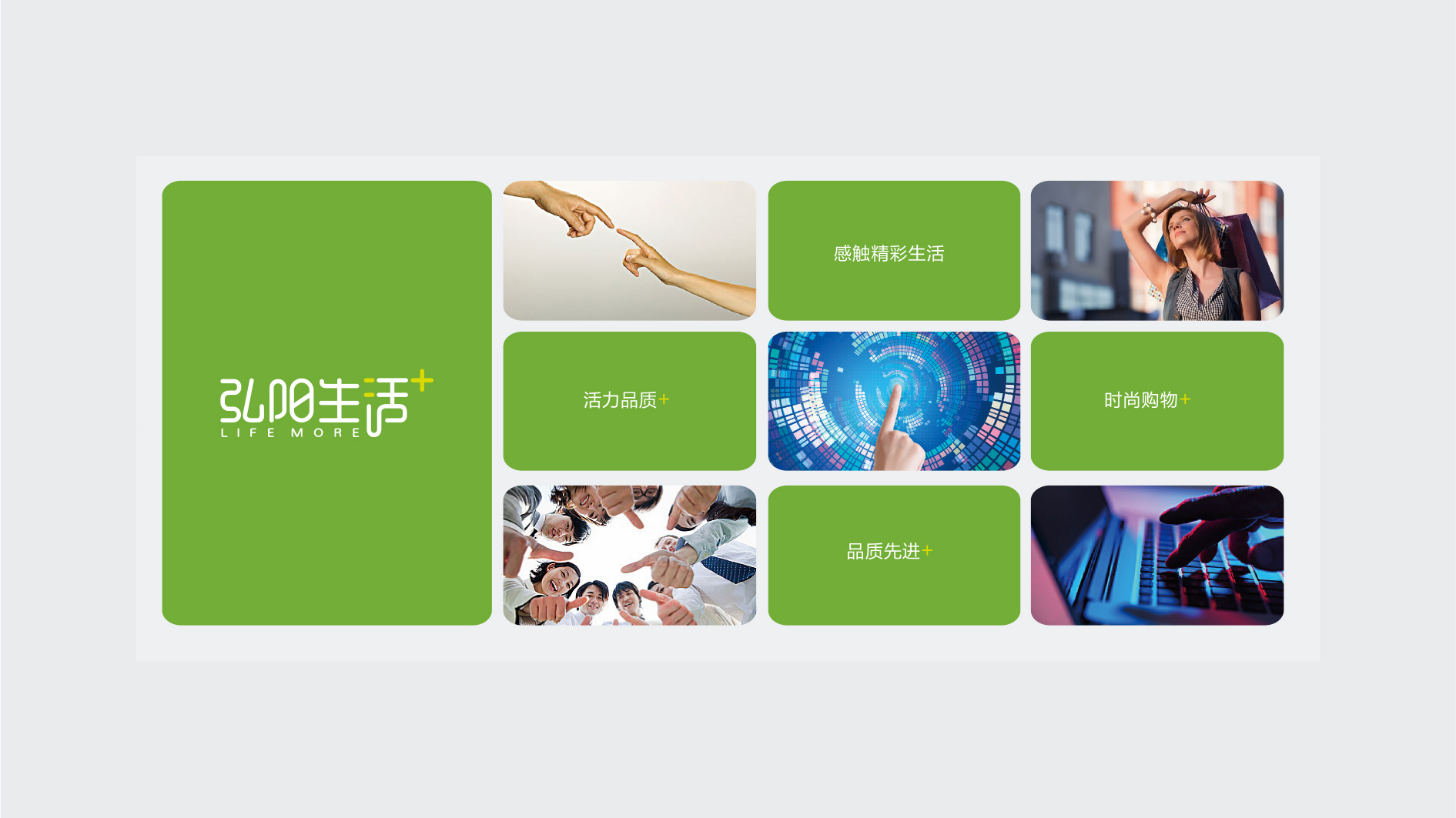 和與德結合弘陽生活+購物中心的提倡的生活理念、發展定位和業態組合的特點,提煉出“感觸精彩生活、活力品質+、時尚購物+、品質先進+”等元素,為其設計品牌標志,從而體現其致力于打造常州最具代表性的潮流、體驗、美食消費中心的發展愿景。
